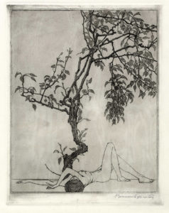 Benvenuto Disertori, Il pero. 1913. Acquaforte. Inciso: mm 273x222. Lastra: mm 298x235. Foglio: mm 495x347. bellini-alberti, 63. Firmata a penna a sfera nera in basso a destra. Alberti data con riserva l'incisione al 1948 sulla base della testimonianza della moglie dell'artista, nonostante lo stile riconducibile al Liberty. Propendiamo tuttavia per la data 1913 riportata dal più recente Benvenuto Disertori. Un segno Liberty, catalogo della mostra a cura di Alessandra Tiddia, Mart, Trento, 2012. Provenienza: Eredi Disertori. (1)
