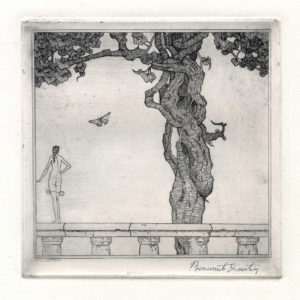 Benvenuto Disertori, La ninfetta. 1913. Acquaforte e bulino. Inciso: mm 179x181. Lastra: mm 199x200. Foglio: mm 535x390. bellini-alberti, 17. Firmata a penna a sfera nera in basso a destra e controfirmata in lastra in basso a sinistra. La farfalla in volo, che nella tradizione iconografica occidentale è simbolo dell'anima, ma anche di fugacità, incostanza e vanità, potrebbe avere in questo contesto una funzione semplicemente decorativa; essa è uno dei soggetti più ricorrenti nella cultura figurativa liberty, dalla quale derivano in questa incisione sia il linguaggio linearistico, sia la tipologia stilizzata e il carattere ornamentale del nudo femminile. Provenienza: Eredi Disertori. (1)
