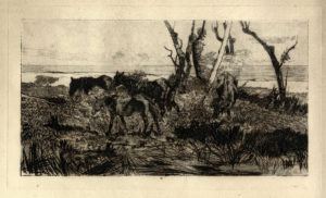 Giovanni Fattori, Pascolo di cavalli. Acquaforte su zinco su carta filigranata "Corona Umbria Italia". mm 242x415. Foglio: mm 340x475. baboni-malesci, tav. CLXIV. Firmata in lastra in basso a destra. (1)