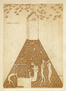 Adolfo Wildt, Casa di Gesù. 1919 ca. Acquaforte e acquatinta stampata in seppia. mm 265x190. Foglio: mm 327x248. Nella lastra in basso a destra: "A.Wildt" e in alto a sinistra: "Casa di Gesù". Stampatore Federico Marioni 1919 ca. Bibliografia: M. Rotunno, Le incisioni di Adolfo Wildt, in "L'arte a stampa", n 5 I/1979, n. 5, p. 19; F. Parisi (a cura di), Disegni & incisioni di Adolfo Wildt, catalogo della mostra, Aleandri Arte Moderna Roma, Rignano Flaminio 2011, n. 2. (1)
