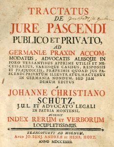 (Johann Christian). Tractatus de jure pascendi publico et privato, ad Germaniae praxin accomodatus [...]. Francofurti ad Moenum, Apud Jo. Benj. Andreae et Henr. Hort, 1732, 4°, [10]-236-[29-1 blanche] p. (lég. bruniss., travail de vers au bas de plusieurs feuillets). Johann Jakob Schütz (Frankfurt, 1640-1690) was a German lawyer and hymnwriter. One of his hymns was reworked by Johann Sebastian Bach as a movement in BWV 117. Relié avec, sous un titre général « Selectae dissertationes » (Lipsiae, Literis et sumptibus Brandenburgerianis, 1705), 14 « disputes » académiques présentées à l'Université de Leipzig, présidées par Jacob Born et précédées de la leçon inaugurale de celui-ci (les 15 pièces ont chacune une p. de titre datée chez le même éditeur de 1704). Relié avec 17 thèses présentées à l'Université de Leipzig sous la présidence de Barthol. Leonhard Svendendörffer, en 1697, 1699, 1700 et 1701, sous l'adresse « Litteris Schedianis » et « Excudebat Christianus Scholvinus ». Ensemble 34 pièces reliées en un vol. en demi vélin ancien à coins (manque de papier au plat arrière).
