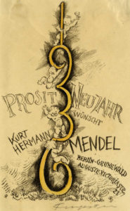 Michel Fingesten, Lotto composto di 2 ex libris. 1936. 1) Glück und Segen im neuen Jahr. 1936. Litografia acquerellata. mm 160x85. Foglio: mm 170x89. Firma a matita in basso a destra. 2) Prosit Neu Jahr. 1936. Litografia acquerellata. mm 155x100. Foglio: mm 166x102. Firma a matita in basso a destra. (2)