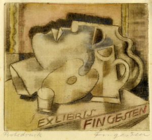 Michel Fingesten, Lotto composto di 3 ex libris. 1937. 1) Ex Libris Fingesten (Stilleben). 1937. Puntasecca e rotella. mm 92x102. Foglio: mm 102x109. NECHWATAL, p. 60. Firma a matita in basso a destra e "probedruck" a matita in basso a sinistra. 2) M. R. Litografia. mm 96x72, Foglio: mm 170x110. DEEKEN, 533. Firma a matita in basso a destra. 3) Invito Mostra d'arte Michel Fingesten pittore e Pietro Fingesten scultore. Litografia. mm 92x69. Foglio: mm 143x90. MIRABELLA-BARDAZZI-BALLERINI, 402. Firma a matita in basso a destra.