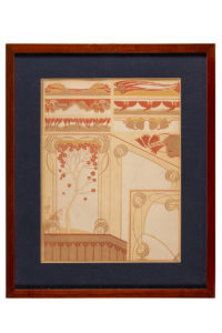 Anonimo liberty, Interno (arancione, beige e oro). Litografia. mm 322x245 (visibili). Timbro non totalmente leggibile in basso a destra. La provenienza di questa incisione e dei seguenti lotti della stessa tipologia è probabilmente un album di decorazioni prodotte da Julius Hoffman e pubblicate da Henri Laurens a Parigi. (1)