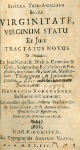 mariage.- KORNMANN (Heinrich). Sibylla Trig-Andriana seu de Virginitate, virginum statu et jure tractatus novus et iucundus [...]. Hagae-Comitum [à La Haye], Ex Typographia Adriani Vlacq, 1654, in-32, [24]-214-[2 blanches]-117-[3]-69-[3] p., plein veau brun moucheté du 18e s., dos lisse orné (coiffes arasées, mors en partie fendus, bas du f. de titre renforcé, très lég. bruniss.). Rare first complete Netherlands edition of three curious Latin works on women, love and marriage, by Heinrich Kornmann : « Sibylla trig-Andriana », « De linea amoris » and « De annulo usitato », published together, at least the first two first published at Frankfurt in 1610. The first treats the rights and duties of women and their conduct in matters of sex, the second is about the commonplace of the five stages of love (sight, conversation, physical contact, kissing and consummation) and the third is devoted to rings, including engagement rings. Kornmann refers to a wide variety of sources, including classical authors and church fathers. He defends women's rights to some degree, but also repeats superstitious beliefs such as that a tree is injured by a virgin's plucking its first fruit. He further discusses incubi and succubi, astrology and the colour of women's cloths (preferably blue, pink, green and white). Robert Burton refers to « De linea amoris » in his 1621 « Anatomy of melancholy », and all three works enjoyed widespread popularity far into the 18th century. The present edition appears to be the only one with a Netherlands imprint, though a 1631 edition in the STCN, perhaps containing the first work only and giving its place of publication as « Virginopoli » may be Dutch. Kornmann, a lawyer from Kirchhain (Germany), also published several works on miracles. Michaud apparently found Kornmann's discussion of sexual matters too frank, writing in 1818 that he had great erudition, but lacked taste and jugdement. The « De linea amoris » and « De annulo usitato » have their own title-pages and were probably issued separately as well, but the « Sibylla trig-Andriana » title-page explicitly mentions them (« Cui accedunt ejusdem authoris tractatus duo, de linea amoris, et de annulo usitato, sponsalito, et signoratoria ») making it clear that the three were designed to be issued together.