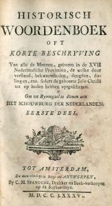 Historisch woordenboek oft korte beschryving van alle de Mannen, geboren in de XVII Nederlandsche Provincien, de welke door verstand, bekwaemheden, deugden, doling [...] Om tot byvoegzel te dienen aen het Schouwburg der Nederlanden. Tot Amsterdam, en men vin-ze te koop tot Antwerpen, C.M. Spanoghe, 1785, 2 tomes in-12, 264, 179-[3] p., reliés en 1 vol., demi-veau glacé du 19e s., dos lisse, pièces de titre et de tomaison, filets et roulettes dorés (dos frotté, rouss. et mouill. claires, manque de papier dans la marge de la p. 32). Barbier, I, 978.