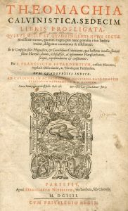 Theomachia calvinistica, sedecim libris profligata, quibus mille et quadringenti huius sectae novissimae errores, quorum magna pars nunc primùm è suis latebris eruitur, diligenter excutiuntur et refelluntur. Parisiis, Apud Sebastianum Nivellium, 1604, in-folio, [16]-432-296-[58] p., plein veau brun du 18e s. (reliure usée, manque au 1er caisson, coiffe infér. arasée, f. de titre lég. souillé, traces de mouill. anciennes à l'angle interne supér. de près de la moitié du vol.). Ex. offert comme livre de prix au 18e s. du Gymnase des Trois Couronnes à Cologne à « Johannes Fridericus De Gruben ». François Feuardent (1539-1610) est un religieux de l'Ordre de Saint-François et docteur de l'Université de Paris, professeur et orateur de la Ligue. Feuardent fut, avec l'évêque de Senlis, Guillaume Rose et le théologien Jean Boucher, parmi les plus éminents prédicateurs dans la cause de la Ligue. Feuardent fut par ailleurs un écrivain actif, ajoutant à sa réputation par plusieurs travaux érudits, par une édition annotée de saint Irénée, par des commentaires sur l'Écriture et surtout par de fougueux ouvrages de controverse. On peut juger du ton de ces livres d'après les seuls titres. Ainsi dans la « Theomachia calvinistica », il tente de réfuter 1400 erreurs des Calvinistes. Peu commun.