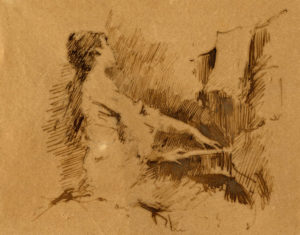 Tranquillo Cremona, Bozzetto per donna al pianoforte. Penna e inchiostro di china bruno su cartoncino. mm 117x145 (visibili). Meraviglioso preparatorio per l'omonimo dipinto scapigliato. (1)