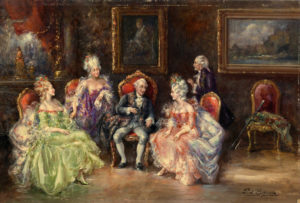 Pablo D'Espinosa, Scena galante. Olio su tavola. cm 29,5x44. Firmato in basso a destra. (1)