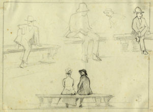 Telemaco Signorini, Studi di figure sedute su panchine. 1900 ca. Matita su carta. mm 148x199. Monogrammato in basso a destra. Pubblicato in: Bucarelli P. (con presentazione di), Mostra di disegni di Telemaco Signorini, 13 aprile-11 maggio 1969, Galleria Nazionale d'Arte Moderna di Roma, Valle Giulia, n. 471. (1)