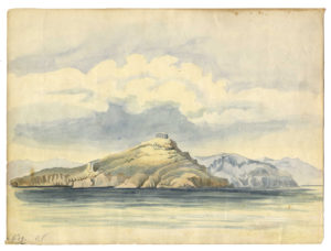 Elihu Vedder, Il tempio. Acquerello e matita su carta. mm 230x310. Siglato in basso a sinistra. Iscrizioni varie a matita al verso. (1)