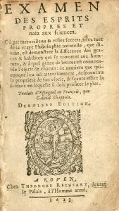 Examen des esprits propres et naiz aux sciences. Où par merveilleux et utiles secrets, tirez tant de la vraye Philosophie naturelle, que divine, est demonstree la difference des grâces et habiletez qui se trouvent aux hommes [...]. Traduit d'Espagnol en François, par Gabriel Chappuis. Derniere edition. Rouen, Theodore Reinsart, 1613, in-32, [5-1 blanc-2]-208 f., plein cuir brun, dos à nerfs, pièce de titre, étui (rel. moderne) (page de titre souillée et en partie détaché, lég. bruniss.). Traduction par Gabriel Chappuis de l'Examen de ingenios para las sciencias que Juan Huarte (né à St Jean Pied de Port) fit paraître en 1580. L'ouvrage fit grand bruit pour la hardiesse des idées de l'auteur. On y trouve de curieux paradoxes. Les derniers chapitres concernent la reproduction humaine, avec des méthodes pour engendrer à volonté filles ou garçons, enfants destinés aux lettres, etc. C'est probablement dans ces chapitres absurdes que J.A. Millot a puisé en 1800 l'idée de son fameux Art de procréer des sexes à volonté. Caillet 5288 (autres éditions).