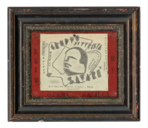 Corrado Forlin, Ecco il Duce futurista. 1935-36. Pastello nero su cartone. cm 11x12,5. Firmato e datato (XIV anno fascista, quindi 1935-36.) al margine sinistro, titolato al destro e dedicato "All'amico Fulvio Giorgi-ONB" all'inferiore. Iscritto: "Gruppo futurista Savarè" e "Monselice". Al verso della cornice applicato un foglio iscritto con intestazione "Camera dei Fasci e delle Corporazioni. Direzione generale degli uffici di questura". (1)