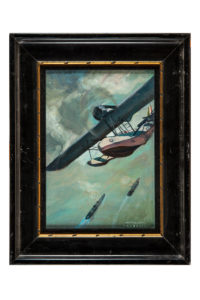Alberto Mastroianni, Battaglia nel Mediterraneo. Anni '40 del XX secolo. Olio su cartone. cm 36x26. Firmato in basso a destra. Al verso, sulla cornice, timbro della collezione Soliani. (1)