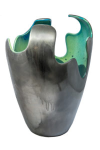 Gerry De Bastiano, Green Collapsing Vase. Ceramica smaltata. cm 40x30x25. Vaso bombato dalla bocca irregolare e organica. Rivestito esternamente di una vernice metallizzata ed internamente di due tonalità di verde differente. L'opera fa parte della serie "Collapsing vases", pensata e realizzata da Gerry de Bastiano dove ogni vaso rappresenta un pezzo unico. (1)
