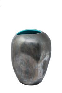 Gerry De Bastiano, Cerulean Collapsing Vase. Ceramica smaltata. cm 29,5x21x21. Vaso bombato dalla bocca irregolare. Firmato ed iscritto "pezzo unico" a pennarello sul fondo dell'oggetto. Rivestito esternamente di una vernice metallizzata ed internamente di un blu ceruleo molto brillante. L'opera fa parte della serie "Collapsing vases", pensata e realizzata da Gerry de Bastiano dove ogni vaso rappresenta un pezzo unico. (1)