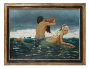 Mauro Falzoni, Il gioco delle onde. 1999. Olio su tavola. cm 50x70. Abbozzi di figure al verso. Dipinto eseguito in occasione della mostra Patty Pravo come un angelo da collezione allestita a Villa Caruso di Lastra a Signa (Firenze) nei primi mesi del 2000. Fervente ammiratore dell'arte di Arnold Böcklin, Mauro Falzoni ha travasato per lungo tempo nei suoi dipinti temi e atmosfere già cari al sogno mediterraneo dei Deutsch Römer (Böcklin, Klinger, ecc.) mettendo però in scena un racconto contemporaneo, come si evince dalla mostra Il silenzio di Dioniso curata da Roberto Roda nel 2003 al Museo del Risorgimento e della Resistenza, in Palazzo dei Diamanti a Ferrara e approdata nello stesso anno alla Saletta Gonnelli di Firenze. Nel 2001, in occasione del centenario dalla morte di Böcklin, Falzoni ha partecipato con il quadro Ritorno dall'Isola dei Morti alla grande mostra Hommage à L'Ile des Morts d'Arnold Böcklin presso il Musée Bossuet a Meaux. Nel dipinto Il gioco delle onde in omaggio a Patty Pravo l'artista cita il dipinto böckliniano Tritone e Nereide creando un curioso e intrigante pastiche con l'immagine della cantante ricavata da una foto di Angelo Frontoni uscita su Playmen nel 1981 in cui lei posa nuda distesa su un mostro in cartapesta di Cinecittà. Alla mostra dedicata a Patty Pravo come musa di ispirazione estetica parteciparono una sessantina di artisti di varie generazioni, tra cui Mario Fallani, Silvano Campeggi, Luigi Doni, Gianni Cacciarini, Rodolfo Meli, Andrea Martinelli, Nicola Verlato, Paolo Schmidlin, Federico Lombardo, fino al gruppo degli Ultrapop. Il dipinto è stato esposto successivamente alle mostre Ninfe e anguane abitavano i boschi e le fontane. Le creature fantastiche delle acque e della natura: percorsi artistici tra '800 e '900 (Bondeno, Pinacoteca Civica, 2001) e Patty Pravo. Metamorfosi di una diva (Firenze, Palazzo Bastogi, 2017). (1)