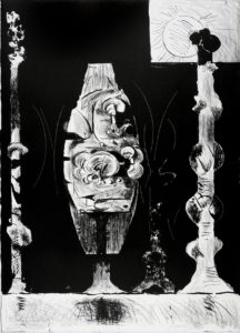Graham Sutherland, Trois formes debout. 1978. Litografia. mm 700x500. Firma a matita in basso a destra e tiratura in basso a sinistra. Es. 41/100. Conservata entro la cartella editoriale originale con stampati nome dell'artista, titolo e tecnica al piatto anteriore. (1)