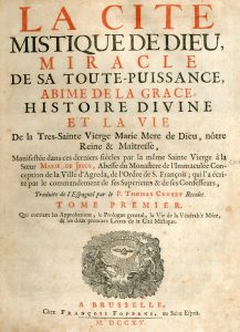 La Cité mistique de Dieu, miracle de sa toute-puissance, abime de la grace, histoire divine et la vie de la Très-Sainte Vierge Marie Mère de Dieu, nôtre Reine et Maîtresse, Manifestée dans ces derniers siècles par la même Sainte Vierge à la Soeur Marie de Jésus, abesse du Monastere de l'Immaculée Conception de la ville d'Agreda, de l'ordre de S. François ; qui l'a écrite par le commandement de ses Superieurs et de ses Confesseurs, traduite de l'Espagnol par le P. Thomas Croset Recolet. Brusselle, François Foppens, 1715, 3 vol. 4°, [28]-CCLX-307-[1 blanche], [10]-715-[1 blanche], [2]-372-[196 (bien complet des 2 f. de la « Table des chapitres » reliés en fin)] p., plein veau brun moucheté de l'époque, dos à nerfs richement décorés, pièces de titre et de tomaison maroquinées rouge et vert (qq. traces d'usure, trois coiffes arasées, lég. bruniss., déchir. marg. au f. 105/106 du 1er vol.). Sans le portrait mis en fronstispice au 1er vol. Célèbre mystique, abbesse du couvent de l'Imaculée-Conception, Marie d'Agreda (1602-1665) nous apprend elle-même que Dieu lui ordonna d'écrire la vie de la Vierge. Ces révélations lui valurent quelques démêlés avec le clergé, mais il ne semble pas que cet ouvrage ait été mis à l'index (Caillet, I, 77 et III 7143 : « ouvrage fort rare »).