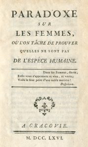 où l'on tâche de prouver qu'elles ne sont pas de l'espèce humaire. A Cracovie, 1766, in-12, 76 p., pleine basane brune de l'époque, dos à nerfs orné (manques au dos). Traduction libre par Charles Clapiès de la « Disputatio perjucunda », parue en 1595 anonymement et attribuée à l'homme de lettres allemand Acidalius Valens (1567-1595) qui nia en être l'auteur. Cet ouvrage est une satire des raisonnements à l'aide desquels les sociniens (il dit « anabaptistes ») contestent le dogme de la divinité de Jésus-Christ. On veut montrer que le même genre de raisonnements permettrait de prouver la non-humanité des femmes. Peu commun.