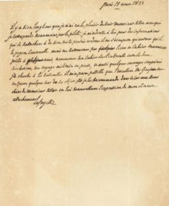 A22. Marie-Joseph de LAFAYETTE (1757-1834). L.A.S., Paris 15 août 1823, à Pierre-François Tissot ; demi-page in-4, adresse. Il y a longtemps qu’il n’a eu le plaisir de voir Tissot, qu’il lit dans Le Pilote : « je m’adresse à lui pour des informations qui se rattachent à de bien tristes pensées et dont il ne s’occupera qu’autant qu’il le jugera convenable. Mais ne retrouvant pas certains livres et cahiers manuscrits prêtés à plusieurs amis, nommément les cahiers sur l’intervalle entre les deux Révolutions, un voyage militaire en Prusse, et aussi quelques ouvrages imprimés je cherche à les rassembler. Il m’a paru possible que l’excellent M. Goujeon eut eu encore quelques uns de ces objets »…
