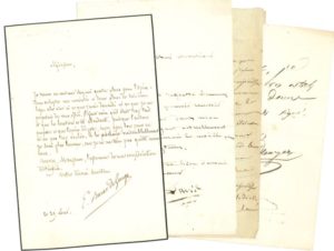 A26. LITTÉRATURE et ARTS. 19 L.A.S. et un poème a.s. Édouard d’Anglemont, Anaïs Aubert (à Frédéric Soulié), Jean-François Bayard, Edmond Burat de Gurgy, Pierre-Jean David d’Angers (à Charles Didier), Louis Desnoyers (2, une à Alphonse Karr), Alexandre Dumas père (à Brossays), Jules Janin (à Charles Mévil), Alphonse Karr (2), Alphonse de Lamartine (à Charles Didier), Henry Martin (2), Giacomo Meyerbeer, Jules-Henry chevalier Redarez Saint-Remy (Le Temps, ode), Jean Reynaud (à Thoré), Étienne Pivert de Senancour (à Charles Didier), Abel Villemain, Charles Walckenaer. On joint un manuscrit de vers du chevalier de Jaucourt.