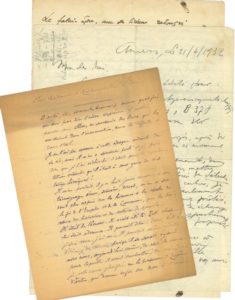 A27. LITTÉRATURE. 7 L.A.S. ou manuscrits. Paul Déroulède, Lucien Descaves (ms a.s. à la mémoire du peintre André Slom, avec plaquette impr. jointe), André de Ridder, Edmond Teulet, Jean-Gustave Tronche (poème), etc. Plus une invitation calligraphiée pour une lecture de Jules Romains à la librairie d’Adrienne Monnier, et un fac-similé de Barbey d’Aurevilly.