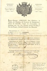 A28. LOUIS-PHILIPPE (1773-1850). P.S. « Louis-Philippe d’Orléans », [1828] ; 1 page in-folio en partie impr. à son entête, vignette aux armes. Permission de chasse dans ses domaines de Vernon, avec autorisation de « tirer le lapin et les oiseaux de passage ».