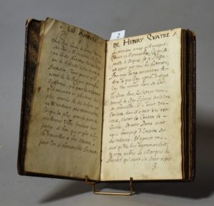 [CONTI (Louise Marguerite de Lorraine, princesse de) - MANUSCRIT]. « Histoire des amours d’Henry le Grand, Roy de France et de Navarre. Escrite par Madame L. Marguerite de Loraine Princesse de Conty. » Manuscrit du milieu du XVIIe siècle en un volume in-8°, veau, double filet doré encadrant les plats, monogramme « g g » au centre, dos à nerfs orné (reliure de l’époque). 74 ff. calligraphiés à l’encre d’un manuscrit de Louise Marguerite de Lorraine, princesse de Conti (1574-1631), qui fut publié à Paris, chez la veuve de Jean Guillemot, en 1651 ou 1652, sous le titre Alcandre ou les Amours du Roy Henry le Grand. De la bibliothèque Benoist de La Pierre, avec ex-libris manuscrit daté de 1669 en page de garde. Quelques petits accidents et restaurations à la reliure ; quelques rousseurs, petites taches et traces de mouillure.