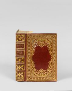 [ALMANACH ROYAL]. Almanach Royal, année M. DCC. LXXXIII. A Paris, Par d’Houry, Imprimeur-Libraire, 1783. In-8°, maroquin rouge, large plaque dorée ornant les plats, dos à nerfs orné de fleurs de lys, tranches dorées, doublures et gardes de moire bleue (reliure de l’époque). Étiquette de Larcher « à la Teste noire ». BEL EXEMPLAIRE en MAROQUIN orné d’une plaque dorée créée par DUBUISSON. Rahir, type F.