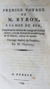 [ANSON - BYRON]. Premier Voyage de M. Byron, a la Mer du Sud, complétant la relation du voyage de l’Amiral Anson, avec un Extrait du second voyage […], autour du monde. A Berlin, 1799. 3 parties en un volume in-8°, demi-basane, dos lisse orné (reliure de l’époque). Rousseurs.