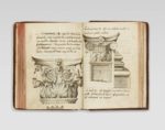 [ARCHITECTURE - MANUSCRIT - SERLIO (Sebastiano)]. Reigles generales de l’architecture, sur les cincq manieres d’edifices, ascavoir Thuscane, Doricque, Ionicque, Corinthe, et Composite, auec les exemples danticquitez, selon la doctrine de Vitruve et de Cerlio. 1556. Reduicte en petit volume par Poncelet, arnoulx estudient en architecture. Manuscrit daté de 1556. In-12 (96 x 131 mm), basane, dos à nerfs orné (reliure début XVIIIe s.). [III] + C-K8, L1. L4, M8, N10, O-Q8. 167 ff. chiffrés de 1 à 171. Copie manuscrite par Arnoulx Poncelet d’une édition de Serlio, illustrée d’un titre orné des armes royales et de plus de 170 dessins, certains à pleine page, d’autres rehaussés à l’aquarelle. L’édition originale « Regole generali di architetura » a été publiée à Venise en 1537. En définissant les cinq ordres majeurs, ce volume a eu une influence considérable sur l’histoire de l’architecture. De la bibliothèque de Giraud avec ex-libris manuscrit sur le contre-plat. Coiffe de tête manquante ; mors fendillés ; coins émoussés.
