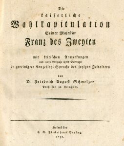 Die kaiserliche Wahlkapitulation Seiner Maiestät Franz des Zweyten mit kritischen Anmerkungen [...]. Helmstädt, Fleckeisesn, 1793, 4°, [8]-LXX-112-95-[1] p., cart. papier de l'époque (lég. frotté). Als Wahlkapitulation (capitulatio caesarea) wird seit dem Mittelalter ein schriftlicher Vertrag bezeichnet, in dem ein Kandidat Zusagen für den Fall seiner Wahl machte, in dem aber auch seine Kompetenzen genau geregelt und Machtbefugnisse eingeschränkt werden konnten.