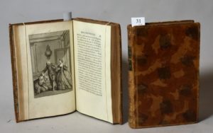 ARNAUD (François Baculard d’). Les Époux Malheureux, ou Histoire de Monsieur et Madame de *** [La Bédoyère]. A Paris, Chez la Veuve Ballard & Fils, Imprimeur, Et chez Laporte, Libraire, 1783. 2 volumes in-8°, veau marbré, triple filet doré encadrant les plats, dos lisse orné, tranches dorées (reliure de l’époque). « Nouvelle édition, corrigée, augmentée de deux nouvelles Parties, qui sont la conclusion de l’Histoire […] » Dix planches gravées par Charles EISEN numérotées 2, 3, 4, 5, 6, 8, 11, 12, 18, 19. Exemplaire enrichi des eaux fortes pures des planches 2 et 3. Accidents marginaux aux feuillets 100 à 114. Il y aurait « en tout 19 figures » mais Cohen (103) « n’en a jamais vu que 10 ».