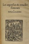 [BOUCHET (Jehan)]. Les Genealogies, Effigies & Epitaphes des Roys de France […]. A Poictiers, Jacques Bouchet, Jehan, & Enguilbert de Marnef, freres, 1545. In-4°, demi-veau, dos à nerfs orné de lys dorés (reliure fin XVIIe s.). 169 ff. [sur 170] ([VI]) + 163 + [I ici en déficit]), signés : aa6, a-l6, m4, n-o6, p8, q-z6, A-C6 & D8. 57 portraits gravés sur bois dans le texte et une vignette sur le titre de la dernière partie (« Les angoysses & remedes d’amours »), f. 143. Ex-libris manuscrit d’un collège de jésuites sur la « Table du livre » (f. II), et quelques inscriptions aux ff. 67 v° et 11 r°. Mors frottés ; page de titre accidentée avec tout petit manque de texte, restauré au v° ; dernier feuillet D8 avec la marque de l’imprimeur en déficit. Saffroy, I, 10237a.