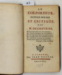 CHEVRIER (François-Antoine de). Le Colporteur, Histoire morale et critique. A Londres, Chez Jean Nourse, L’An de la Vérité, s. d., [La Haye, 1753]. In-12, veau tacheté, triple filet doré encadrant les plats, dos lisse orné (reliure de l’époque). ÉDITION ORIGINALE ? Barbier II, 575 ; Gay-Lemonnyer II, 435 ; Cioranescu, 19477 ; Quérard II, 186.
