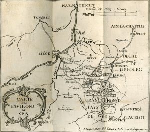 Traité des eaux minérales de Spa. Seconde édition, revue, corrigée et augmentée par l'Auteur, à laquelle on a joint une carte des environs de Spa. Liège, F.J. Desoer, 1756, 8°, [12]-286-[12] p. (2 parties en pagination continue, les 50 premières p. num. en chiffres romains), 1 carte dépliante, demi-basane mouchetée de l'époque à coins, dos à 5 nerfs, titre, roulettes et fleurons dorés (rel. postér. frottée, titre sali, petite mouill. marginale à qq. f.).