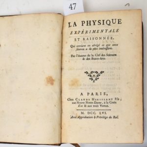 [COCHET (Jean)]. La Physique expérimentale et raisonnée […]. A Paris, Chez Claude Herissant Fils, 1756. In-12, veau, dos à nerfs orné (reliure de l’époque). ÉDITION ORIGINALE. Coiffes restaurées ainsi que deux coins en queue ; quelques rousseurs et piqures. Poggendorff ; I, 458.