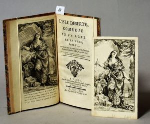 [COLLET (Jean-Baptiste)]. L’Isle déserte, comédie en un acte et en vers. A Paris, Chez N. B. Duchesne, Libraire, 1758. In-12, demi-veau blond, filet doré bordant les plats, dos à nerfs orné, pièce de titre en maroquin rouge, tranches dorées (Louis Marchand Rel. Paris). ÉDITION ORIGINALE. Un frontispice gravé par Noël Le MIRE d’après Charles Nicolas COCHIN. JOINT : un état supplémentaire du frontispice à l’eau-forte pure.