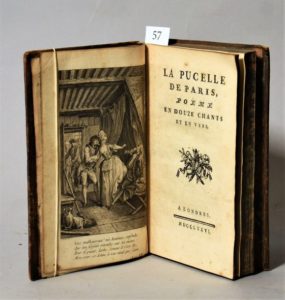 [Du CONGÉ-DUBREUIL (Alphonse)]. La Pucelle de Paris, poëme en douze chants et en vers. A Londres, 1776. In-8°, veau, fine roulette dentelée dorée encadrant les plats, dos lisse orné (reliure de l’époque). ÉDITION ORIGINALE. Un frontispice gravé d’après Claude Louis DESRAIS. Accidents sur la coiffe et premier mors fendu.
