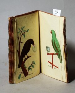 [ENFANTINA – LIVRE à TRANSFORMATION]. Album d’images gravées. S.l.n.d. [circa 1780]. In-12 broché. Recueil de 82 gravures aquarellées, parfois répétées, la plupart imprimées tête-bêche. La tranche extérieure, inégale, permet de les faire défiler par thèmes : personnages masculins ou féminins, cavaliers, scènes, vues diverses ou oiseaux.