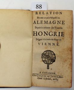 [MILITARIA]. Relation de tout ce qui s’est passé en Alemagne depuis la descente des Turcs en Hongrie jusques à la levée du Siege de Vienne. A Cologne, Chez Jaques le Jeune, Marchand Libraire, 1683. In-16, cartonnage bleu, dos lisse orné (reliure début XIXe s.). Quelques rousseurs.