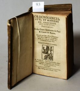 [PAYS-BAS]. • Nouvelle Ordonnance, et moderation du Roy nostre Sire. Sur le fait des Loix, & Coustumes du Pays & Conté de Namur, decretee & autorisee par Sa Majesté le 27. Septembre 1564 […]. •• Ordonnances, styl et maniere de proceder du Conseil Provincial et des Cours subalternes du Pays & Conté de Namur […]. ••• Privilege touchant la redemption des rentes en la Ville de Namur. À Namur, Chez Jean Godefrin, 1652 & 1650 et s.l.n.d. 3 titres en un volume in-12, vélin ivoire à petits recouvrements, traces de lacs, titre à l’encre au dos (reliure de l’époque). Reliure assombrie avec petits accidents au dos.