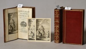 [PLAUTE]. Marci Accii Plauti Comoediæ quæ supersunt. Parisiis, Typis J. Barbou, 1759. 3 volumes in-12, maroquin rouge, triple filet doré encadrant les plats, dos à nerfs orné, tranches dorées (reliure de l’époque). Trois frontispices et trois bandeaux par Charles EISEN. Exemplaire enrichi de deux états supplémentaires du premier frontispice dont un à l’eau-forte pure. Dos passé (vol. I).