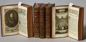 [QUINAULT (Philippe)]. Le Theatre de Mr Quinault, contenant ses Tragedies, Comedies, et Opera. A Paris, Chez Pierre Ribou, Seul Libraire de l’Académie Royale de Musique, 1715. 5 volumes in-12, veau, double filet doré encadrant les plats, dos à nerfs orné, pièces de titre et de tomaison en maroquin rouge (reliure de l’époque). « Dernière édition, augmentée de sa vie, d’une Dissertation sur ses Ouvrages, & de l’origine de l’Opera. » Deux titres-frontispices, un portrait de Philippe Quinault et 30 planches gravées. Petits accidents aux coiffes ; travail de ver sur un mors.