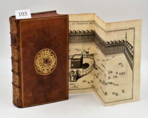 RELAND (Adrien). La Religion des Mahometans […] Et augmenté d’une Confession de Foi Mahometane qui n’avoit point encore paru. A La Haye, Chez Isaac Vaillant, 1721. In-12, veau blond, double filet doré encadrant les plats, doubles armoiries au centre, dos à nerfs orné de pièces d’armes (reliure de l’époque). Un titre-frontispice et cinq planches, dont quatre repliées. De la bibliothèque de Mr de Mareste, avec ex-libris. EXEMPLAIRE aux ARMES et aux PIÈCES d’ARMES de Jeanne Baptiste d’ALBERT de LUYNES, comtesse de VERRUE (1670-1736). Habiles restaurations à la reliure.