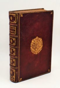 [RELIURE en MAROQUIN aux ARMES]. Office de la Semaine Sainte […] Avec des Refléxions et Meditations, Prieres et Instructions pour la Confession et communion […]. A Paris, Chez la Veuve Mazieres et Garnier, Libraires Imprimeurs, 1746. In-8°, maroquin rouge, filet doré encadrant les plats, fleur de lys aux angles, doubles armoiries au centre, dos à nerfs orné de lys, tranches dorées (reliure de l’époque). Un titre orné et trois planches gravées en taille-douce par Jean-Baptiste SCOTIN. De la bibliothèque Freiherrlieh V. Leoprechting’sche, avec timbres humides. EXEMPLAIRE en MAROQUIN ROUGE aux ARMES de Marie Thérèse d’ESPAGNE (1726-1746), première femme du dauphin Louis de France, père du roi Louis XVI.