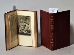 [RESTIF de La BRETONNE (Nicolas Edme)]. Tableaux de la Vie ou Les Moeurs du dix-huitième siècle. À Neuwied sur le Rhin, Chez La Société Typographique, & a Strasbourg, Chez J. G. Treuttel, s. d. [1790]. 2 volumes in-12, chagrin rouge, fine roulette dentelée dorée encadrant les plats, dos à nerfs orné, tête dorée (Bound by Beet, Conduit St.). Première édition sous ce titre de cette « nouvelle distribution du texte du Monument du costume physique et moral de la fin du dix-huitièmesiècle » paru en 1789 (Rives Childs, XXXIX-1, 315-319). Dix sept planches gravées en taille-douce [par Freudeberg & Moreau le Jeune].
