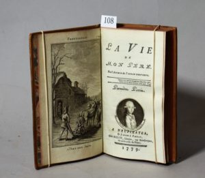 [RESTIF de La BRETONNE (Nicolas Edme)]. La Vie de Mon Père. A Neufchatel, Chés Belin, Libraire 1779. 2 tomes en un volume in-12, veau, dos lisse orné avec armoiries en queue (reliure de l’époque). Deuxième édition contenant toutes les caractéristiques citées par Rives Childs et dont une nouvelle page 151 (première partie) est collée contre l’ancienne. Portraits de l’auteur et de Barbe Ferlet sur les titres et quatorze planches gravées, dont deux en frontispices. Reliées in fine : trois pages sur « Le nouvel Abeilard ». Armoiries caviardées. Rives Childs, XIX-2, 249-250.