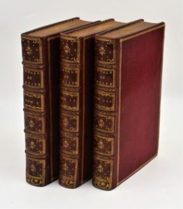 [TACITE]. Tibère, ou Les Six premiers livres des Annales de Tacite. A Paris, De l’Imprimerie Royale, 1768. 3 volumes in-12, maroquin rouge, triple filet doré encadrant les plats, dos à nerfs orné, tranches dorées (reliure de l’époque). Une vignette sur le titre, une vignette de dédicace aux armes du duc de Choiseul qui l’ouvrage est dédié, bandeaux et six planches gravées d’après Hubert François GRAVELOT. De la bibliothèque Amédée Rigaud, avec ex-libris. Très légères rousseurs ; cahier L du tome II roussi. BEL EXEMPLAIRE en MAROQUIN ROUGE de l’ÉPOQUE.